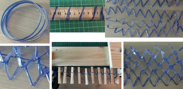 De techniek met de petflessen werkte niet goed. De zigzag's krompen erg snel in elkaar. In plaats van het net van petflessen om de tas heen besloot ik een macramƩ net van single-use plastic tasjes te maken.
